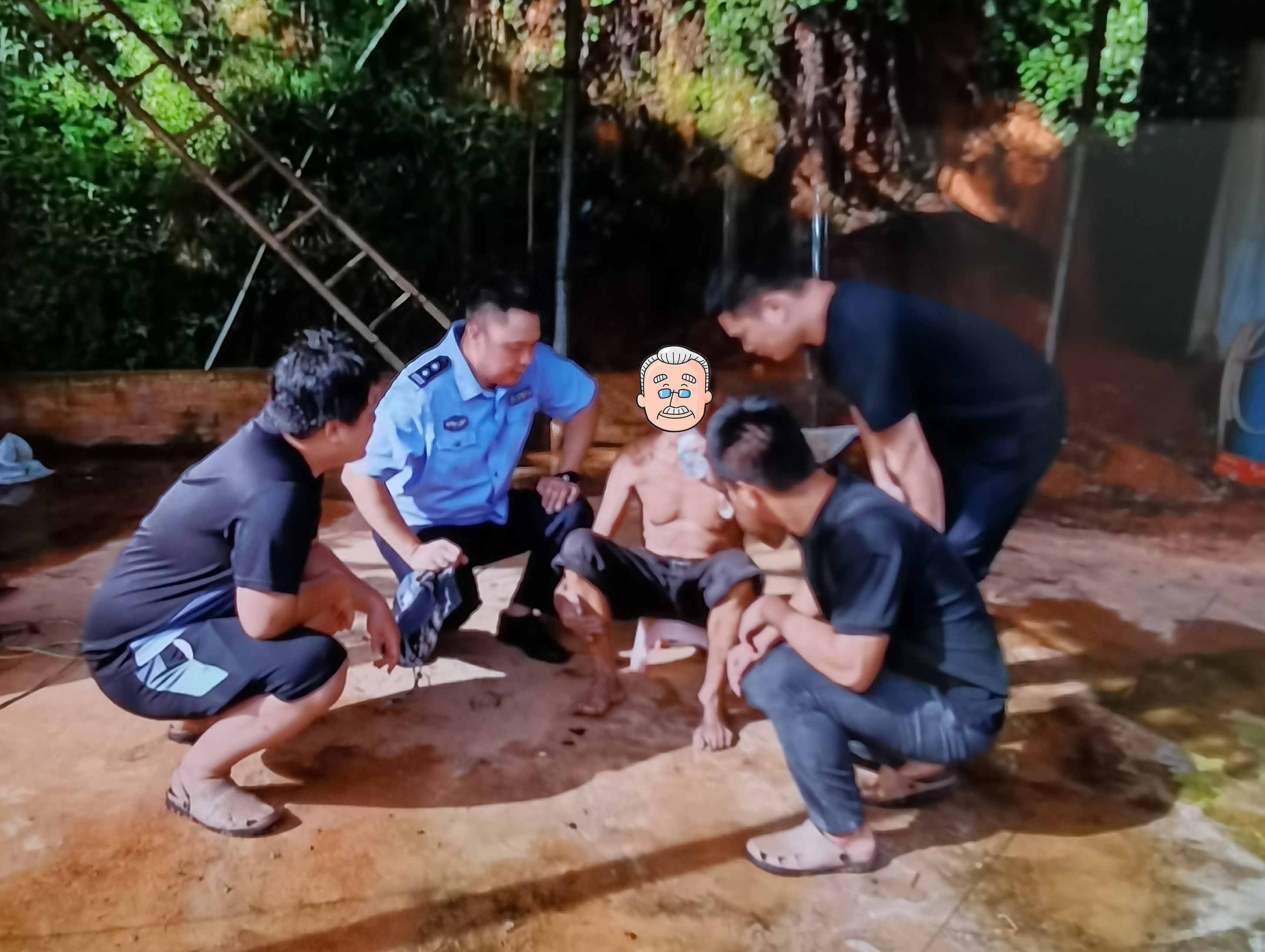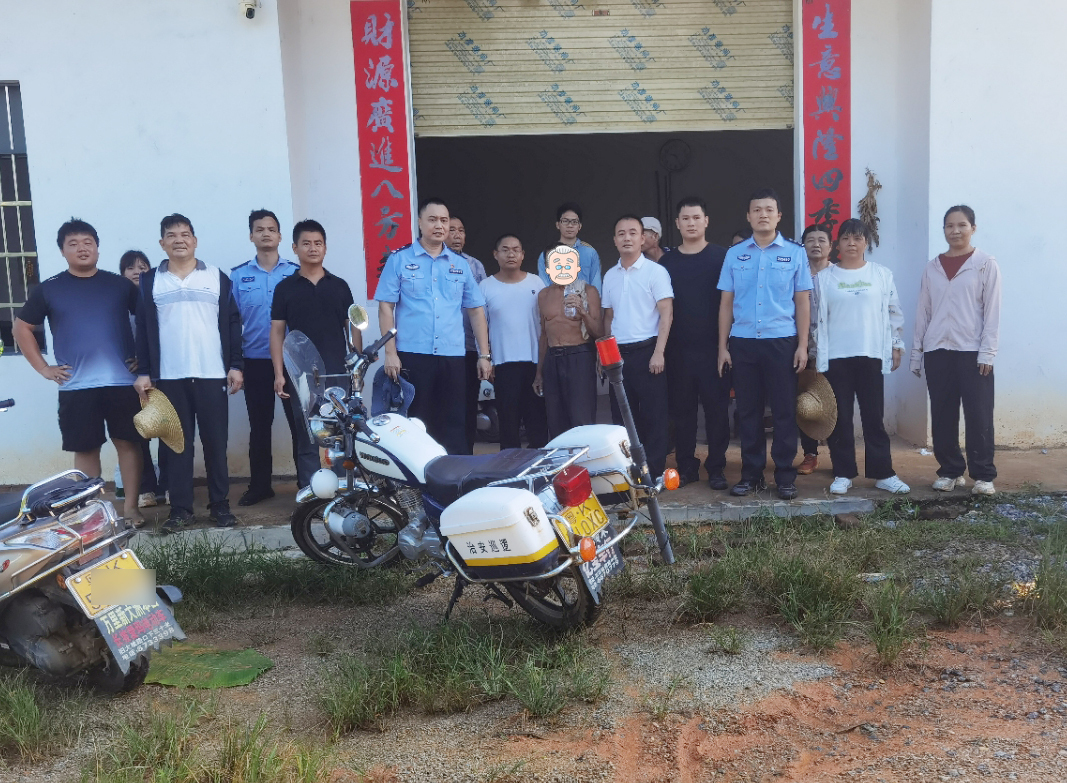功夫不负有心人,搜寻人员翻山越岭,终于在搜寻到一个养猪场前,发现了老人的手电筒遗漏地上,确定了老人就是在此附近。民警组织村委会及群众分5组围绕老人最后出现位置四周开展搜寻,在附近村民的带路协助下,8月13日16时许,在养猪场香蕉地附近找到该名老人。由于找到前一个小时,刚刚又下了一场暴雨,找到该名老人时,他全身湿透,嘴唇发黑。经仔细检查,老人身体并无大碍。民辅警搀扶老人回到村委会处休息,将老人交由家属带回看护。家属对民辅警的热心帮助表示了衷心的感谢。